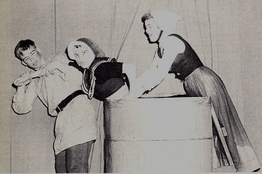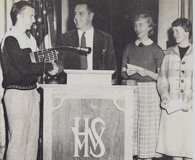 First place winner of the "I speak for Democracy" contest, accepts a radio from John DeMarco as Joyce Reichert & Lois Kerley, third & second place winners respectively, watch